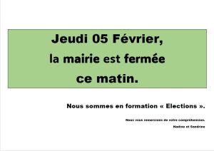 FERMETURE DE LA MAIRIE – JEUDI 5 FÉVRIER AU MATIN – Formation- Réouverture à 13h –