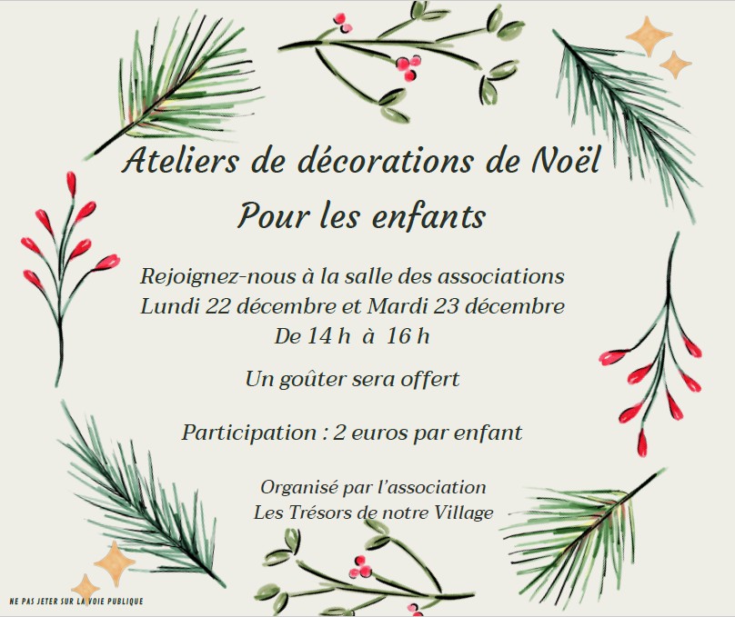 ATELIER NOËL ENFANTS – 22 ET 23 DECEMBRE 2025 -Salle des Associations – 14h-16h –