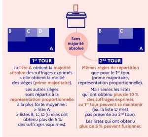 Le mode de scrutin applicable est le scrutin de liste à deux tours :